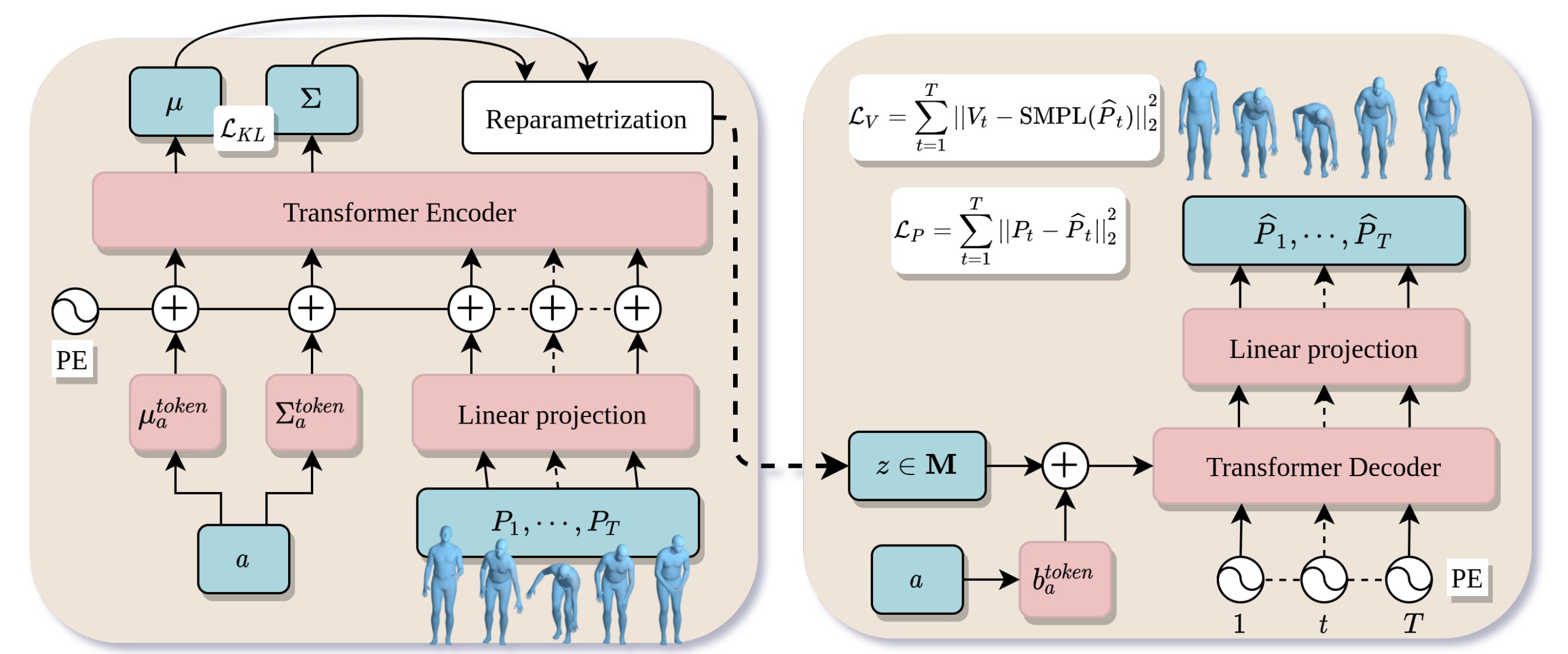 There’s a couple adjustments that we can make based on intuition and empirical results. Because of the sequential nature of our temporal input, we can utilize a transformer-based architecture instead of a U-Net to obtain better performance. Another observation is that a person’s body shape does not change within the timeframe of a single motion, so we should treat it as a prior instead of an input feature to promote training stability (\(D\) is now \(23 \cdot 6 + 6 + 3\)).