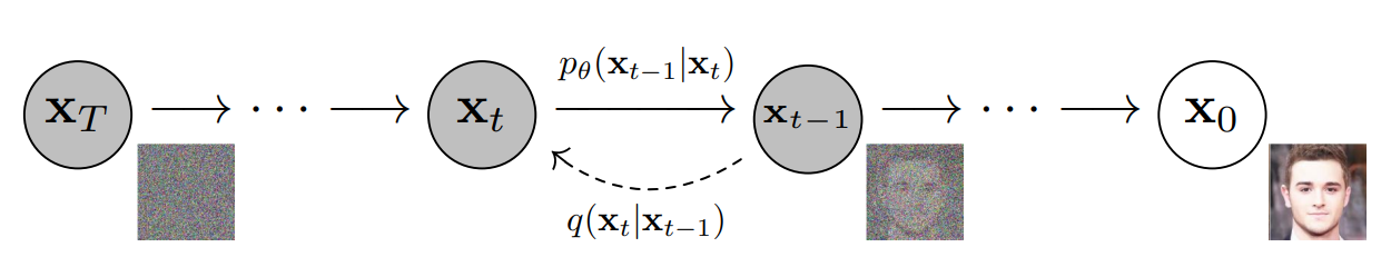 \[q(x_{0}, ..., x_{T}) = q(x_{0}) \prod_{t = 1}^{T} q(x_{t} \vert x_{t - 1})\]where \(q(x_{t} \vert x_{t - 1}) = \mathcal{N} (\sqrt{1 - \beta_{t}} x_{t - 1}, \beta_{t} \bf{I})\).