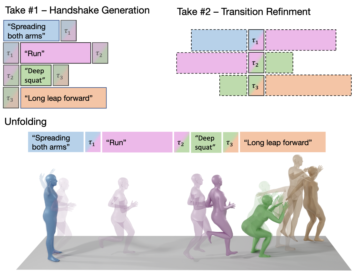 In the first take, short-term motion intervals are generated independently as a batch. A handshake is then maintained at each denoising step, where the transition segments are replaced with the frame-wise average of the corresponding motion prefixes and suffixes. This ensures a certain extent of consistent generation between intervals. The update equation is as follows: