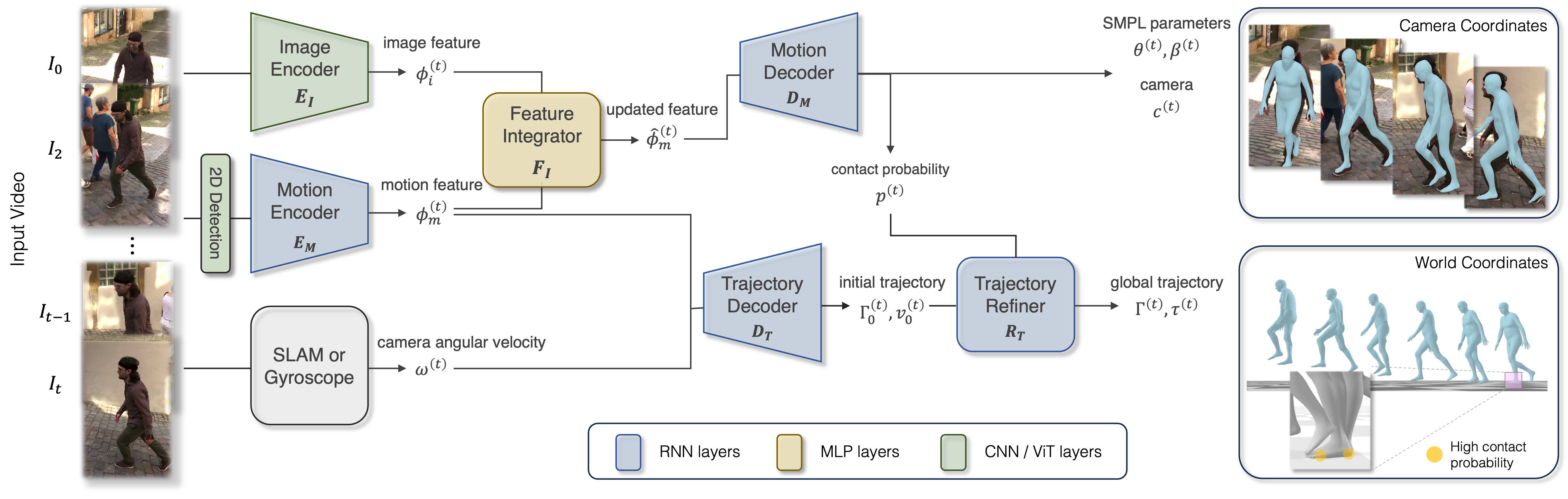 Recall that SMPLify uses an intrinsic camera matrix \(K\) to regress projected SMPL joints, meaning that the fitted SMPL mesh will lie in the provided frame’s coordinates. Now consider the case where the camera moves with each frame. An issue arises because the resulting SMPL meshes will not be contained in a unified coordinate system, so the sequence of meshes would not capture the true motion. Another point to examine is the computational inefficiency with frame-wise processing. We would prefer a method that can output all meshes in one go.