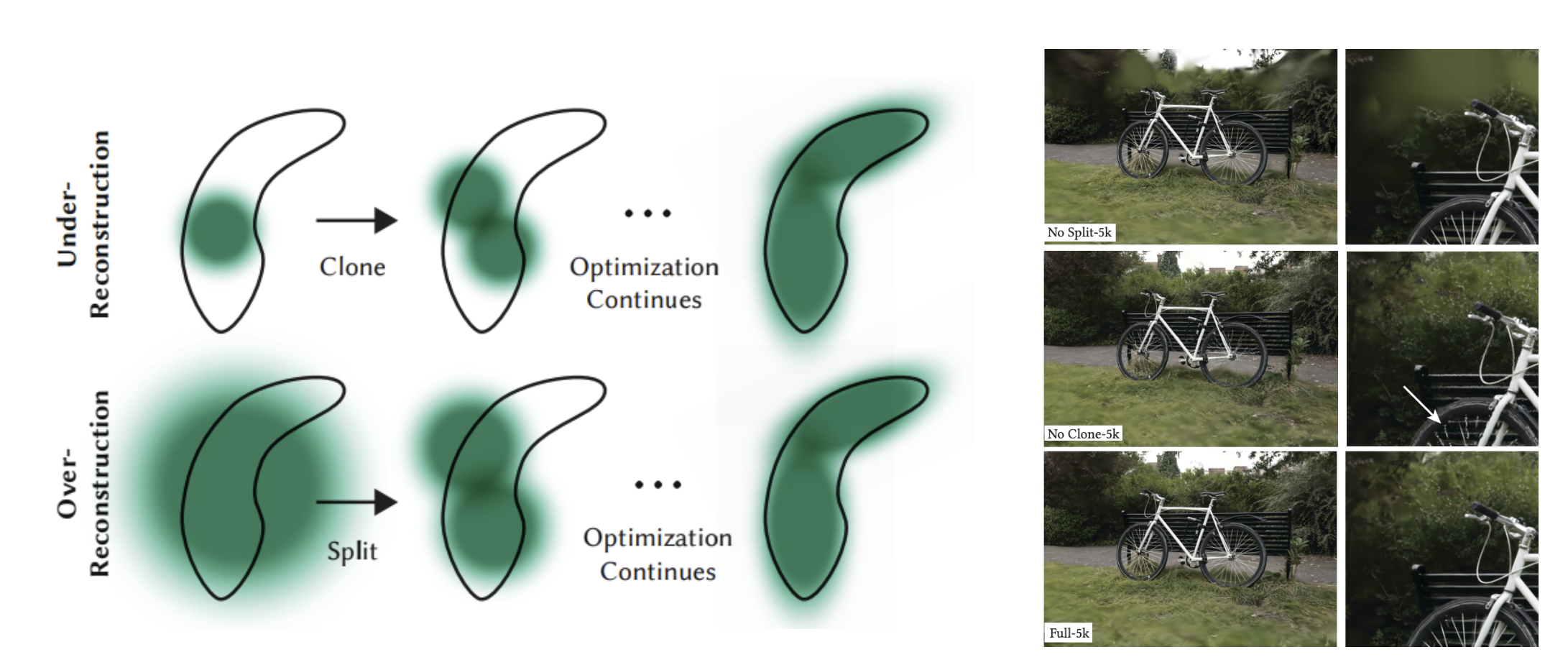 - Small Gaussians in under-constructed regions: Clone the small Gaussian at the same location and move its clone in the direction of the positional gradient.