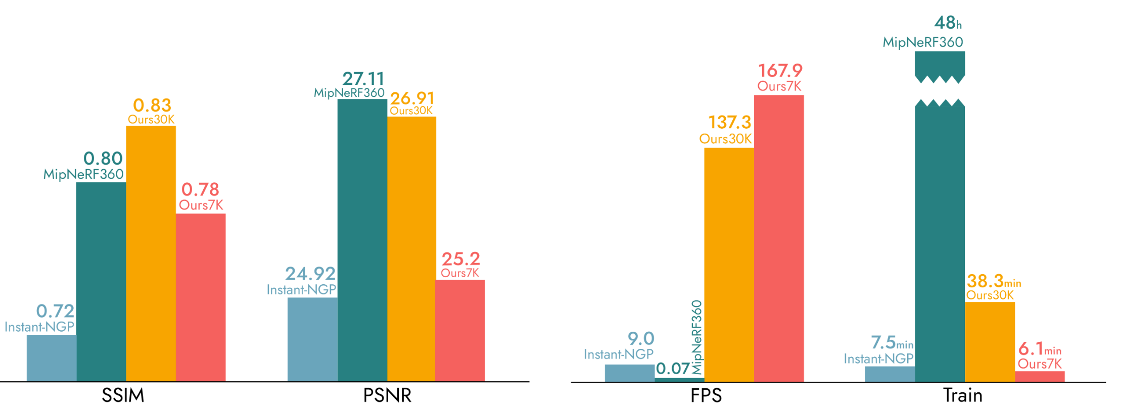 One of the major advantages of 3D gaussian splatting is its superior rendering efficiency in comparison to NeRFs, while achieving similar if not better performance on multiple metrics. These findings by the original authors are summarized below.