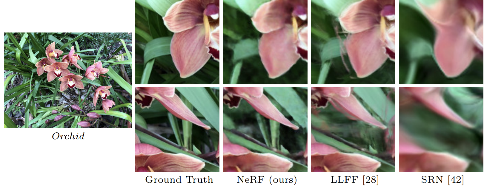 As shown in the example above, NeRF tends to render more detailed reconstructions when compared to previous baselines (fern leaves are less blurry and orchid patterns better match the ground truth). Additionally, NeRFs are able to much more accurates capture occluded parts of the scene, such as in the yellow shelves in the fern crops, especially when compared to LLFF methods and SRN. Aside from enhanced visual reconstruction, NeRFs also require much less memory than LLFF, which produces a large 3D voxel grid for each image. On the other hand, NeRFs only need to store the weights for the neural network. For reference, the memory requirement for one “Realistic Synthesis” scene is 15GB when using LLFF and only 5 MB for NeRF.
