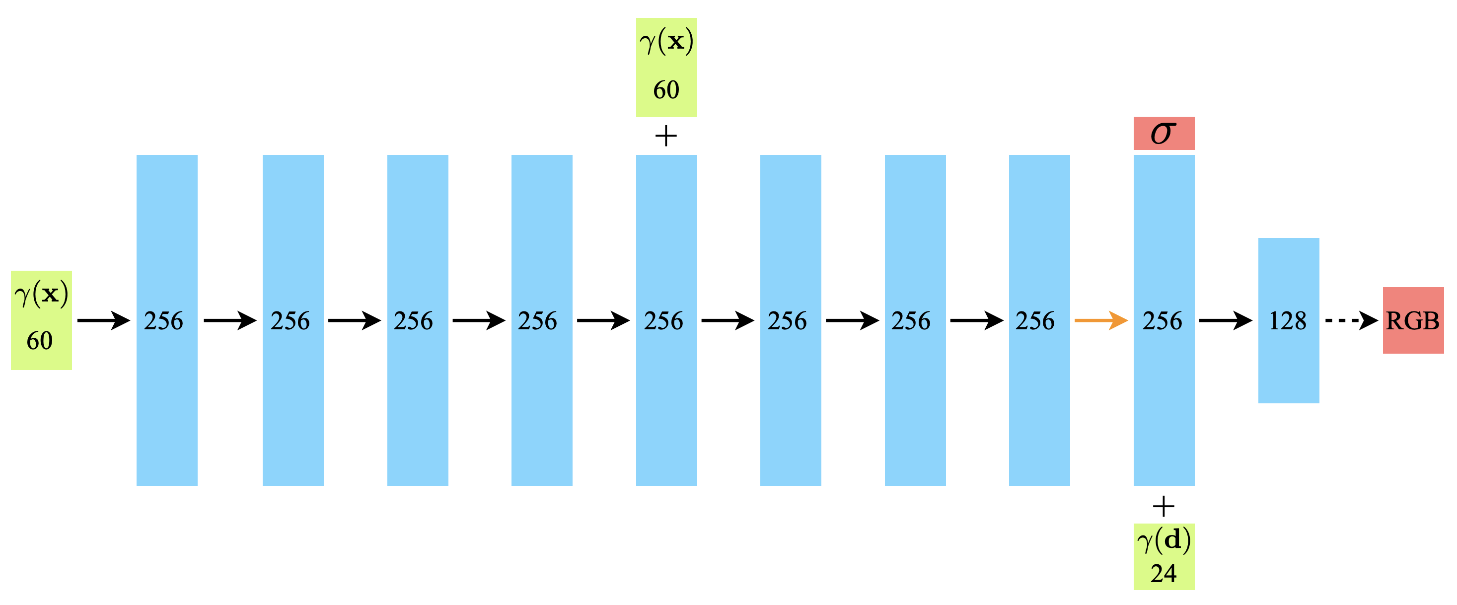 At this point, we have obtained a set of query points (locations + viewing directions), which we can input into a multi-layer perceptron (i.e. fully connected network) and predict the color and volume density. The architecture used in the original paper is depicted below: