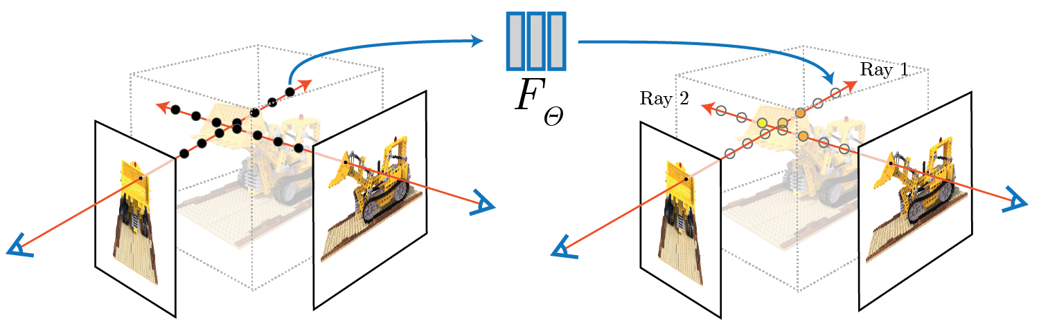 As mentioned before, we’d like to make our sampling process efficient by adaptively sampling more points in high-density areas. To accomplish this, two models are constructed: one coarse and one fine. The coarse model uniformly samples along each ray and its output is used to determine areas of high-density. The fine model then adaptively samples based on the coarse model’s results. The outputs of the fine model are used for the final rendering.