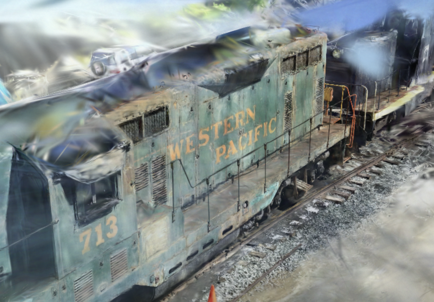 We noticed many interesting results when visualizing our trained Gaussian Splatting model on the train image. We noticed there was still an issue with large world-space Gaussians, as we can observe large, elliptical blurs clustering around the edges of the original 2D images (sky, ground). While the primary subject of the splat, the train engine, and its nearby objects are relatively well rendered and have few visual artifacts, our model still fails to render to objects less visible in the training images, especially unseen views (including the background). We also notice patchy areas, where it’s clear that there is under-reconstruction and a distinct lack of gaussian to fill the volume, with parts of the mountainous terrain missing.